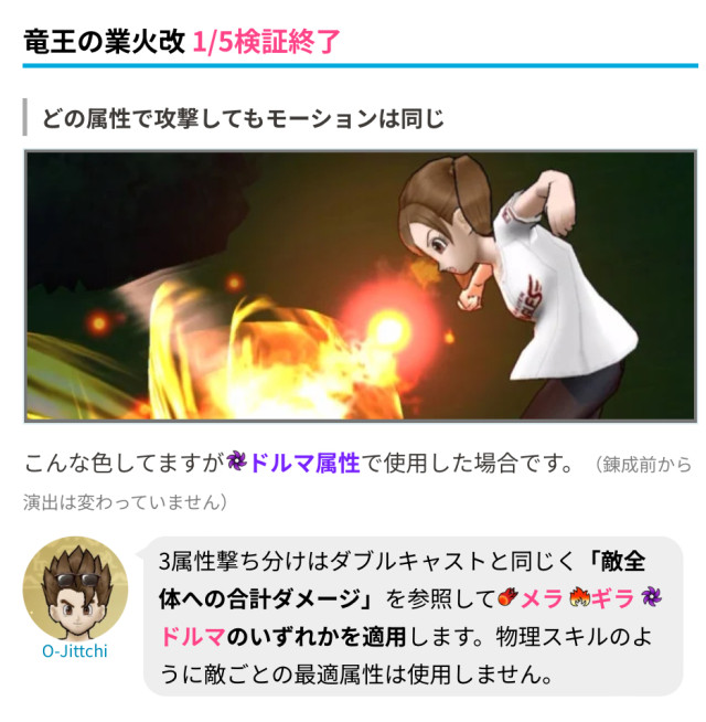 | 練度1 | 竜王の業火改 / 消費MP 57 闇の覇者たる竜王のごとき業火で 敵全体にメラかギラかドルマ属性の ブレス特大ダメージを与える たまにブレス耐性を下げる |