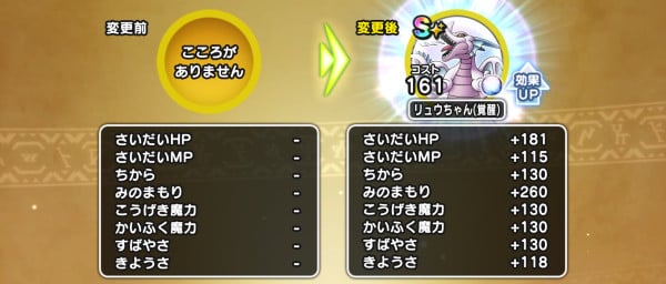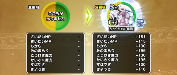 | 永続パッシブ | 僧侶レベル50(かいふく魔力+10) 踊り子レベル50(かいふく魔力+10) 遊び人レベル55(かいふく魔力+5) 賢者レベル90(かいふく魔力+15) スパスタレベル90(かいふく魔力+15) 大神官レベル70(かいふく魔力+30) |