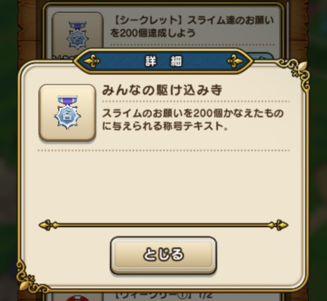 - スライムたちのお願い100個:称号「みんなの相談所」