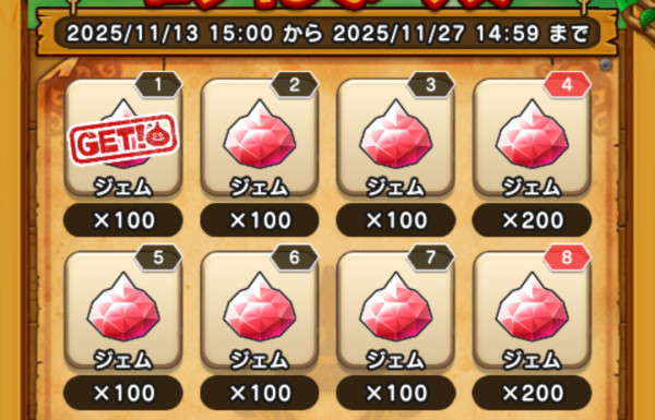 ![]() | ジェム×6230個 イベントログボ前半:1000個 イベントログボ後半:1000個 イベント1章クリア:200個 イベント2章クリア:200個 イベント3章クリア:200個 EDクエストクリア:50個 住民スライム報酬(18体):1100個 住民スライムB棟報酬(15体):1100個 住民スライムC棟報酬(15体):1100個 強敵「スラマシンZ」討伐:200個 図鑑埋め(3体):合計60個 図鑑埋め(1体)(足軽スライム分):合計20個 |