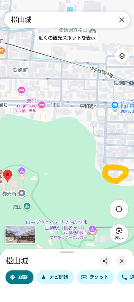 災害の影響を考慮し、位置の調整が行われました。当サイトのお城の位置も「松山駅付近」に移動をしております。