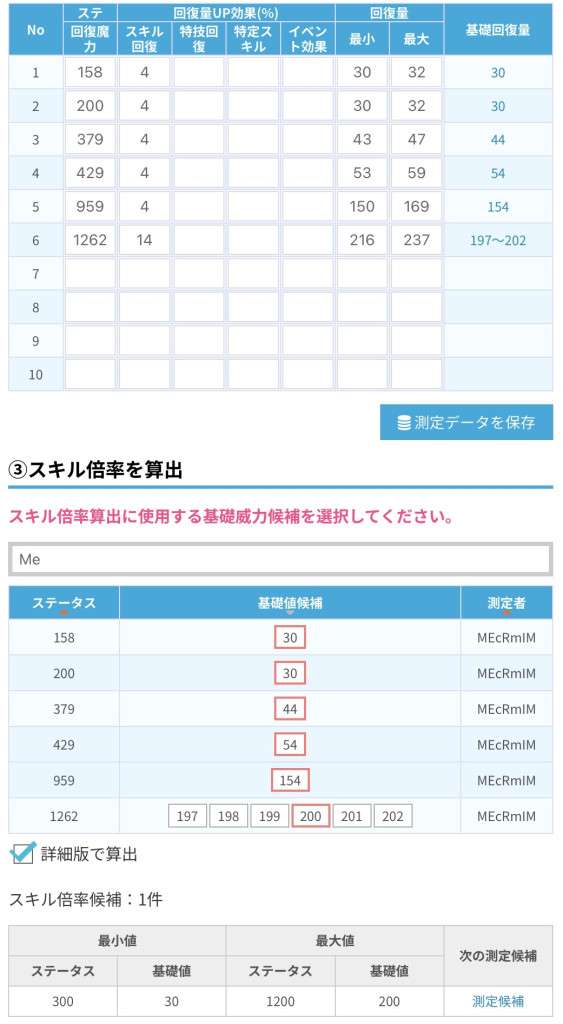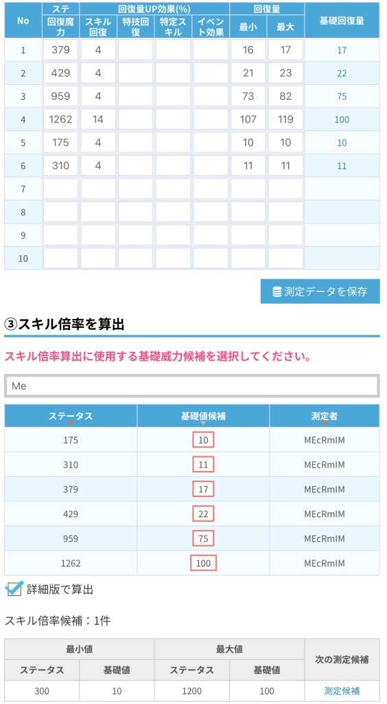 上記スキル倍率が正しいと仮定した場合に、スキル倍率候補を効率良く絞り込む測定ステータスを探すことができます。ピンク背景は測定時に基礎値を1つに絞り込めず、黄色背景は1つ違いのため要注意。