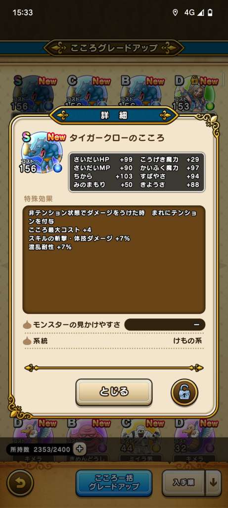 タイガークローのこころSの性能と必要個数|出現方法