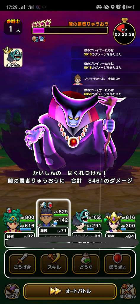 通常より難易度の高いであろう、制限上級職レベル75「闇の覇者りゅうおう」が出現します(75未満は挑戦できない)。ギガモンのように、タブで普通のりゅうおうと切り替えができるよう。