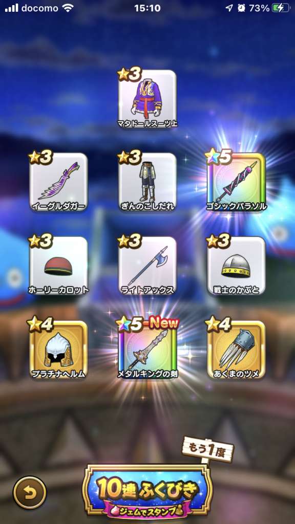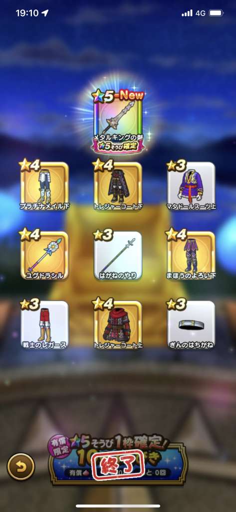 さっきマイレージ券の10連一回だけでメタキン剣が当たってしまった。今まで最後の最後まで周年祭の武器出なくてイライラしたのが嘘みたい。