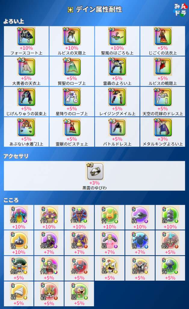 耐性のある装備品のタブ切り替えでデイン属性耐性を掲載しておりますので、よければご活用ください。