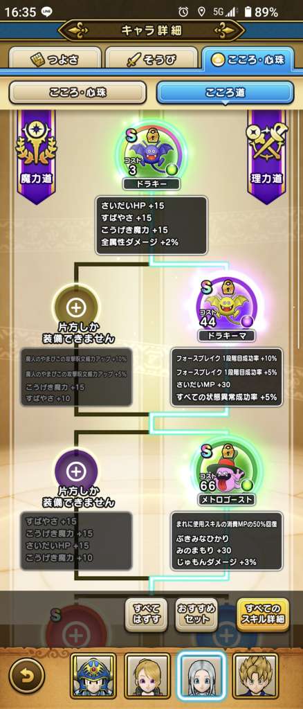 同キャラクターの「こころ枠」と「こころ道」に同じこころは装着できません。例えば、こころ枠に「スライム」を使っていた場合、こころ道は✖。また、同パーティ内で別のキャラが付けているこころも✖。