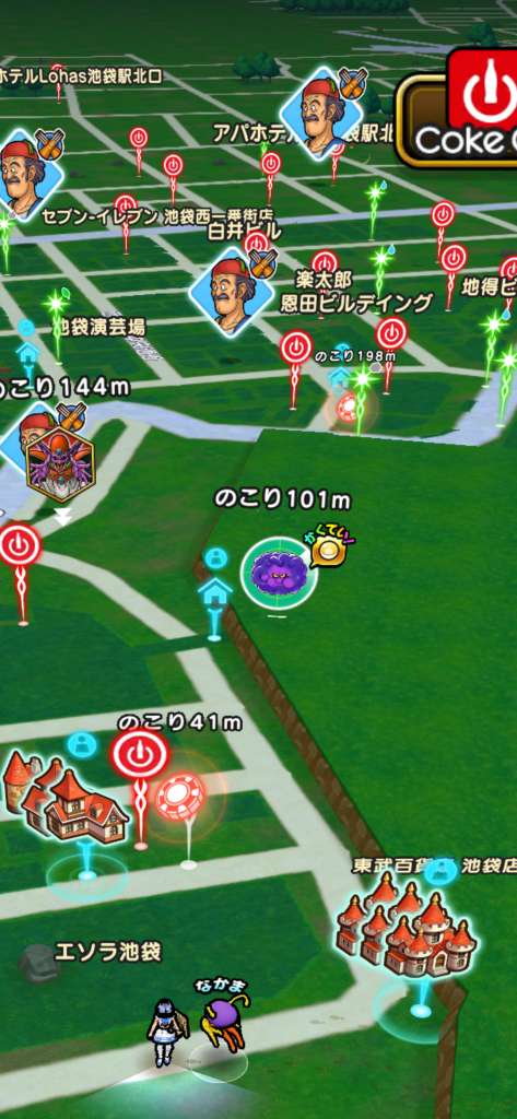 全国の自動販売機が「コラボスポット」となり、ドラクエウォークゲーム内に出現します。コークオン(CokeON)の赤いアイコンが目印。
