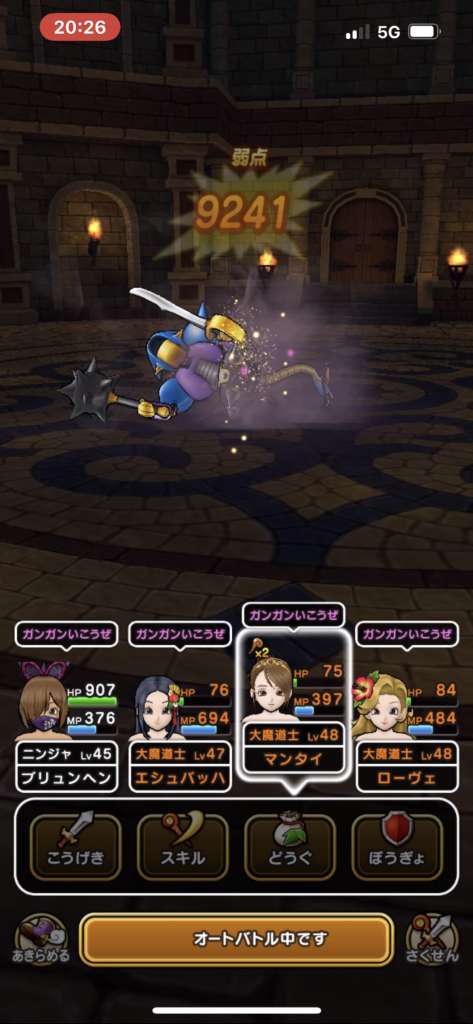 全員ガンガン行こうぜでひたすら攻撃。グランゼ忍はひたすら雷刃。状態異常成功率目当てでハーゴンやゲマ付けると、呪文耐性減が入った後にライデイン撃ってしまうので、麻痺成功率は地獄の騎士と心珠でカバー。忍者にはドルマゲスとブレア、装備と心珠もみかわし付きの物をかき集めて装備。