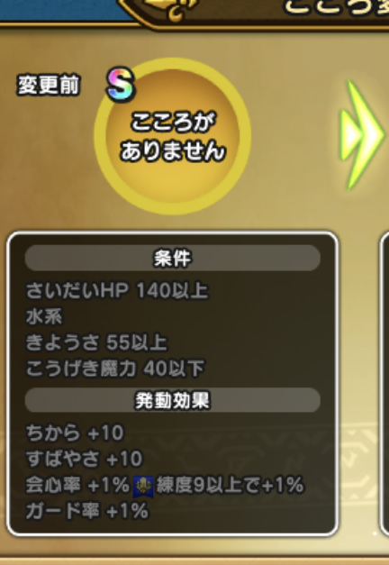 | 悪い状態変化耐性-8% 痛恨の一撃の会心ダメージ倍率+15% さいだいHP+15【バトマス】練度4以上で+10 会心率+2% | すべての状態変化耐性-5% 痛恨の一撃の会心ダメージ倍率+25% さいだいMP+10【まもマス】練度4以上で+10 スキルの斬撃・体技ダメージ+1% |