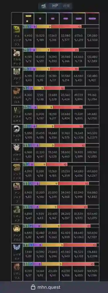レイアとレイア亜種比較だと、同じ☆ならレイアの1.1~1.13倍の範囲に収まる。おそらく、☆が上がるにつれ倍率が上がる傾向がありそうだけど、☆6~☆8の間では大きな変化は無さそう。