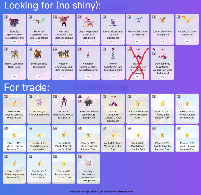 I'm looking for Shiny Pokémon with any Background or Location Card, and I can offer Pokémon that I've caught from 2016-2019.