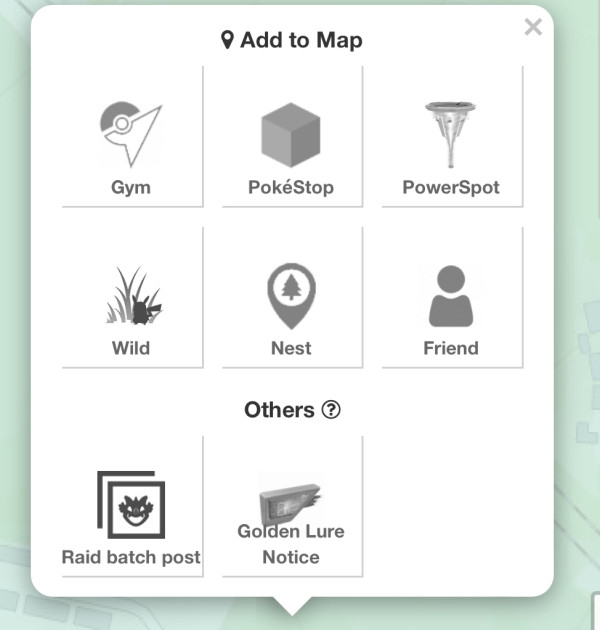 You can newly register Pokémon GO spot info (Gyms, PokéStops, Power Spots), wild spawns, and nests. You can also register current raid info in bulk or announce Golden Lure installations.