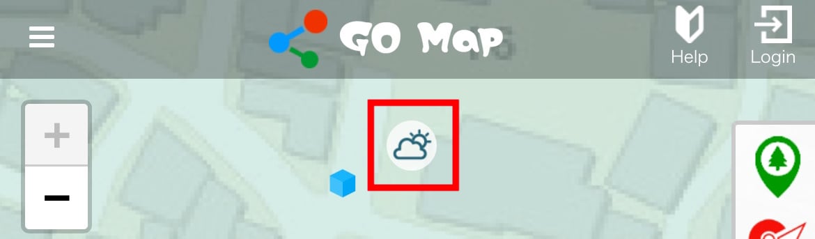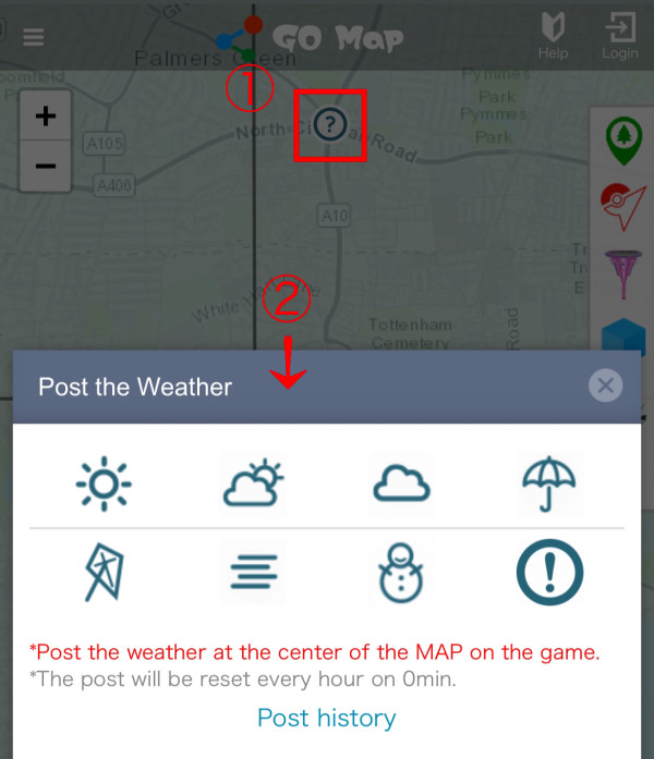 To post weather info, center the map on the location you want to post for, tap the “Weather Icon” (if not registered, it will show a “?” mark), and select the current in-game weather.