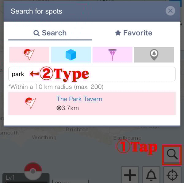 By tapping the “Magnifying Glass Icon” in the bottom right, you can search for gyms, PokéStops, power spots, and nests within a 10 km radius.