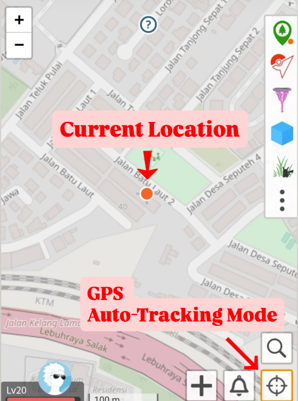 In this mode, your current location will always be centered on the map, and spot info like gyms and PokéStops will be automatically fetched as you move a certain distance. The auto-tracking mode will be disabled if you manually move the map.