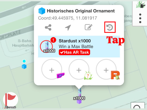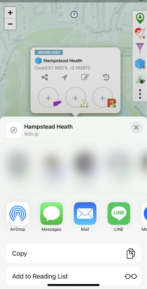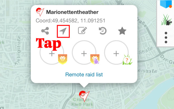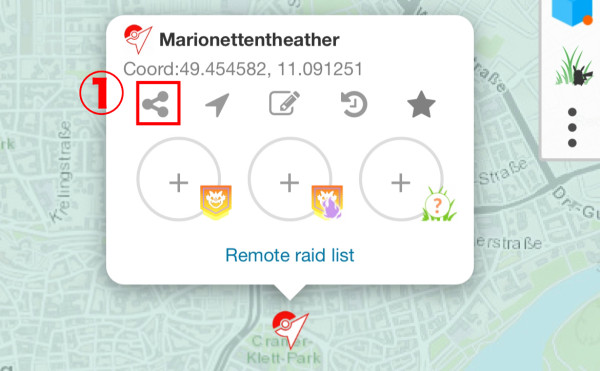 Tap the “Spot or Icon” you want to share, then tap the “GO Raids Mark Icon” inside the balloon to get and share a URL that indicates that location.