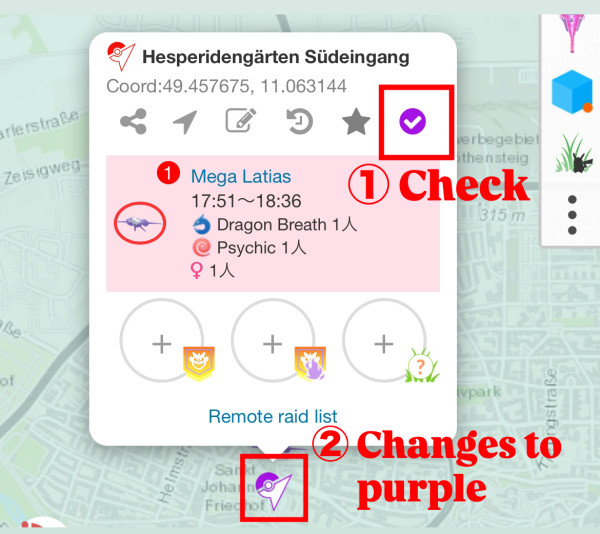 When you tap “Check” at the top right of a Gym balloon where a raid is happening, the Gym icon will also change to purple to show it’s verified.