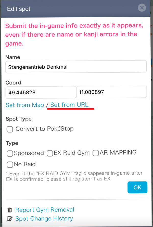You can set the coordinates of PokéStops or Gyms in GO Raids using a URL that includes the accurate coordinates obtained by any of the methods above.