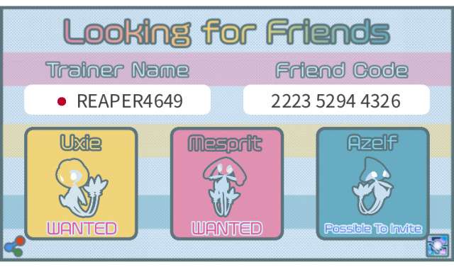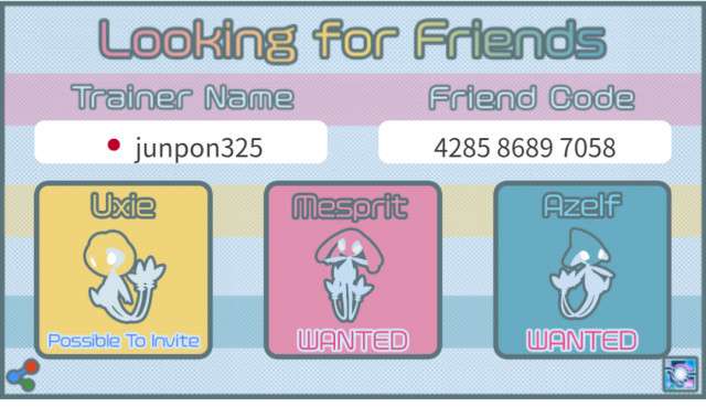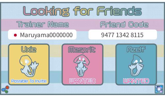 トレーナー名、トレーナーコード、国を入力した後、ユクシー、エムリット、アグノムをタップして「wanted(欲しい)」または「Possible to invite(招待できる)」を切り替え、「Save Picture」ボタンを押して画像を保存して下さい。Tweetボタンを押し保存した画像を添付することで簡単にフレンド募集できます。