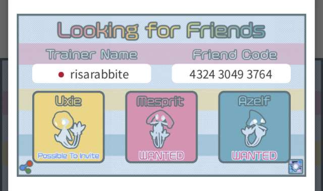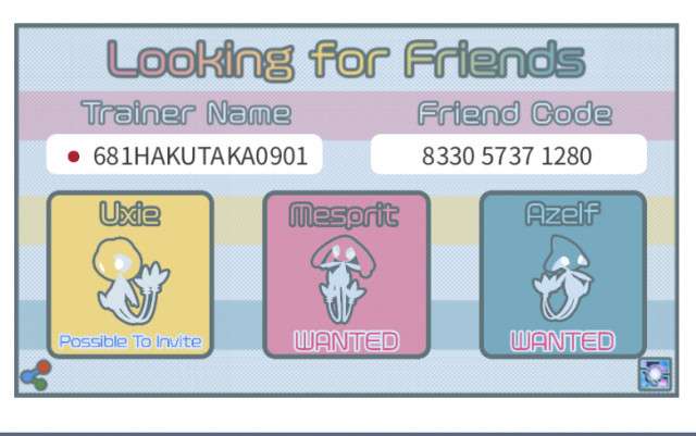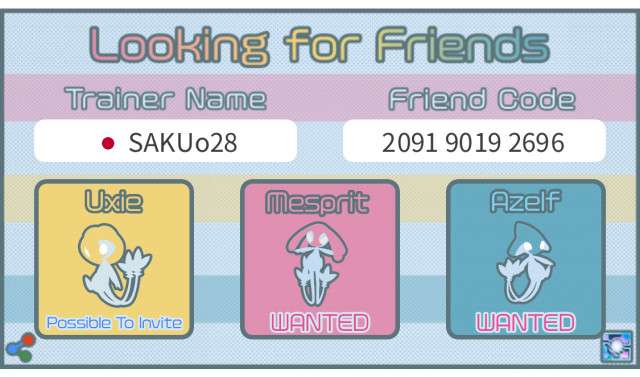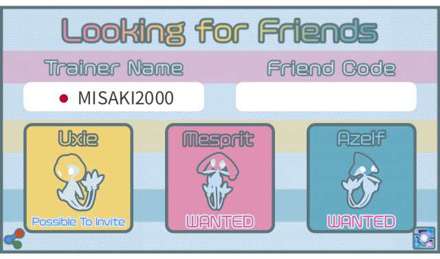 トレーナー名、トレーナーコード、国を入力した後、ユクシー、エムリット、アグノムをタップして「wanted(欲しい)」または「Possible to invite(招待できる)」を切り替え、「Save Picture」ボタンを押して画像を保存して下さい。Tweetボタンを押し保存した画像を添付することで簡単にフレンド募集できます。
