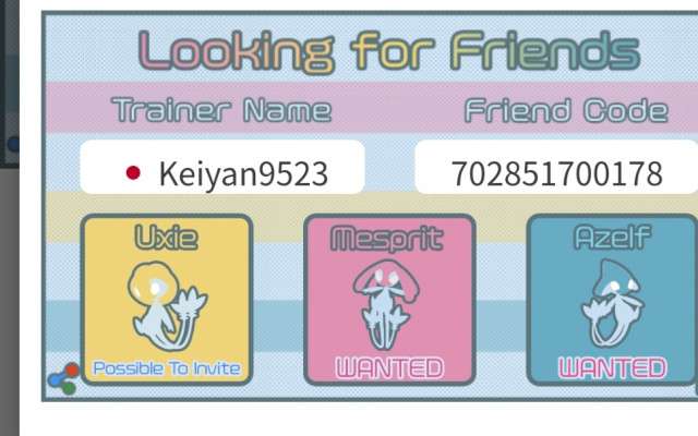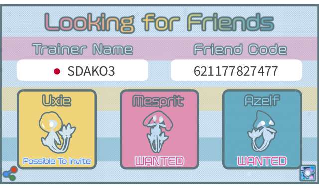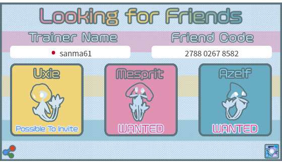 トレーナー名、トレーナーコード、国を入力した後、ユクシー、エムリット、アグノムをタップして「wanted(欲しい)」または「Possible to invite(招待できる)」を切り替え、「Save Picture」ボタンを押して画像を保存して下さい。Tweetボタンを押し保存した画像を添付することで簡単にフレンド募集できます。