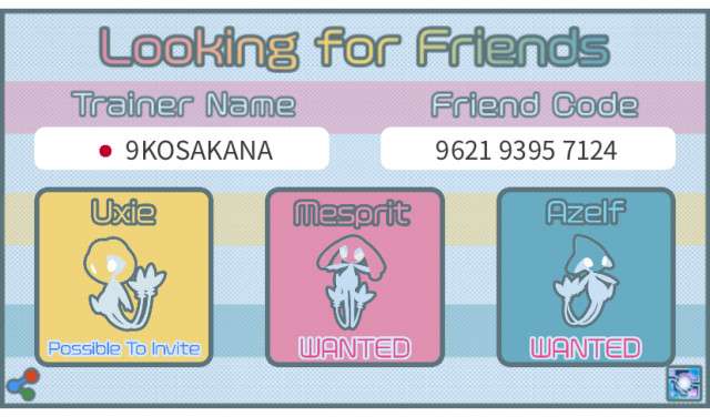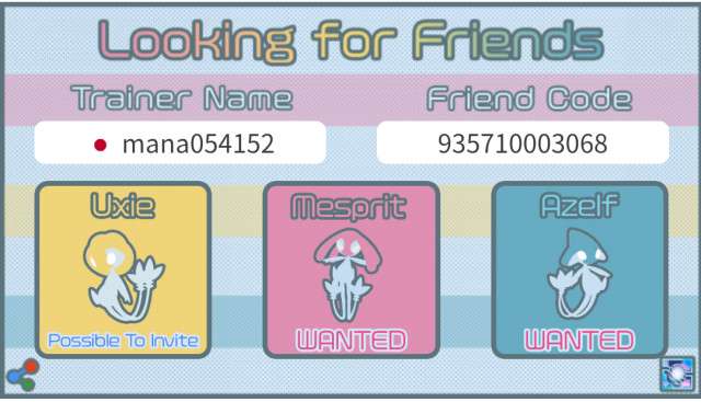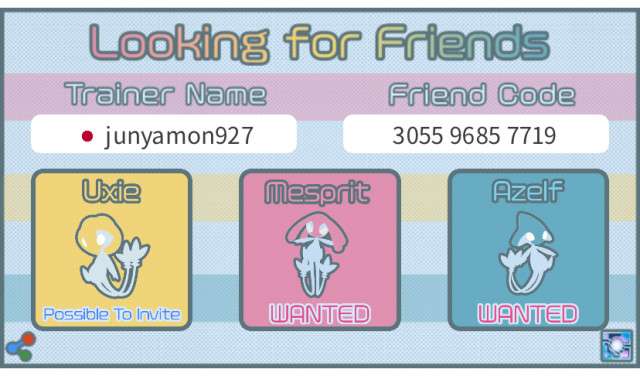トレーナー名、トレーナーコード、国を入力した後、ユクシー、エムリット、アグノムをタップして「wanted(欲しい)」または「Possible to invite(招待できる)」を切り替え、「Save Picture」ボタンを押して画像を保存して下さい。Tweetボタンを押し保存した画像を添付することで簡単にフレンド募集できます。