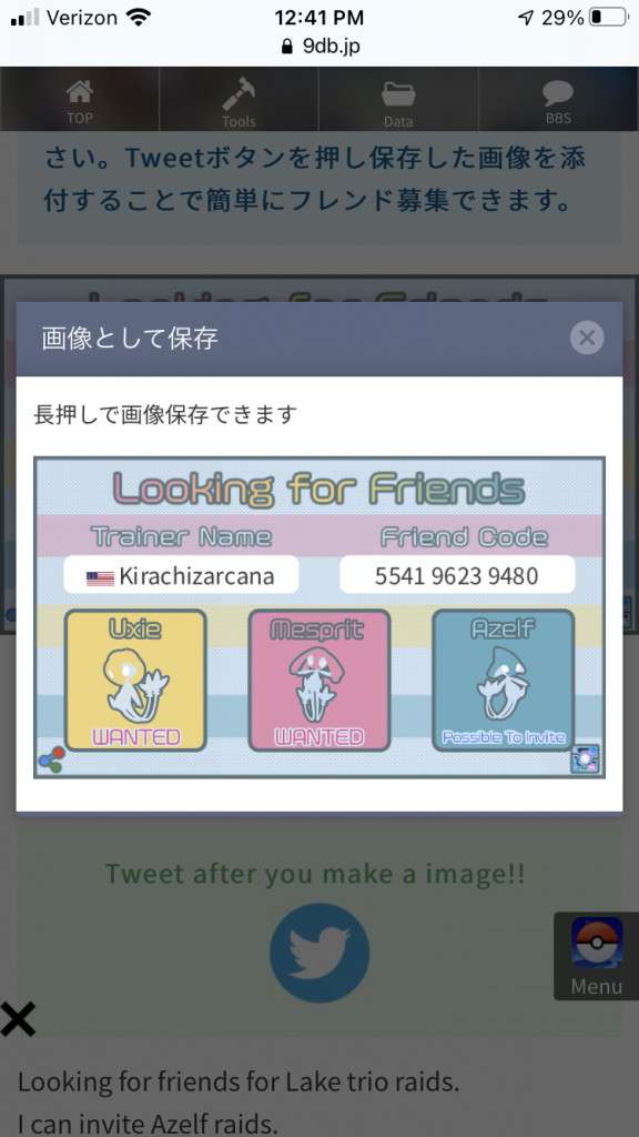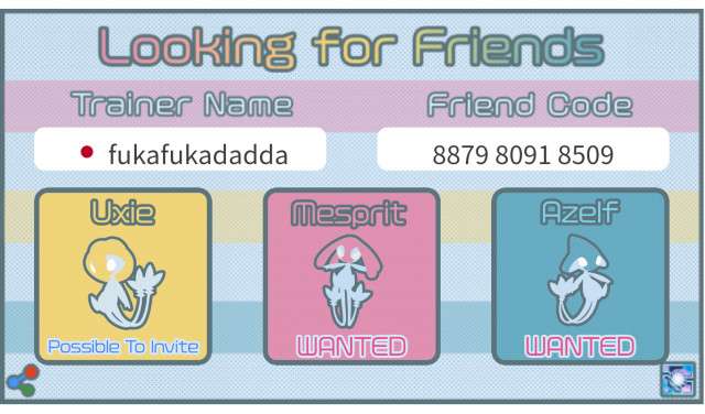 トレーナー名、トレーナーコード、国を入力した後、ユクシー、エムリット、アグノムをタップして「wanted(欲しい)」または「Possible to invite(招待できる)」を切り替え、「Save Picture」ボタンを押して画像を保存して下さい。Tweetボタンを押し保存した画像を添付することで簡単にフレンド募集できます。