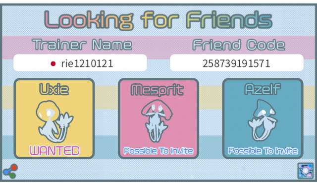 トレーナー名、トレーナーコード、国を入力した後、ユクシー、エムリット、アグノムをタップして「wanted(欲しい)」または「Possible to invite(招待できる)」を切り替え、「Save Picture」ボタンを押して画像を保存して下さい。Tweetボタンを押し保存した画像を添付することで簡単にフレンド募集できます。