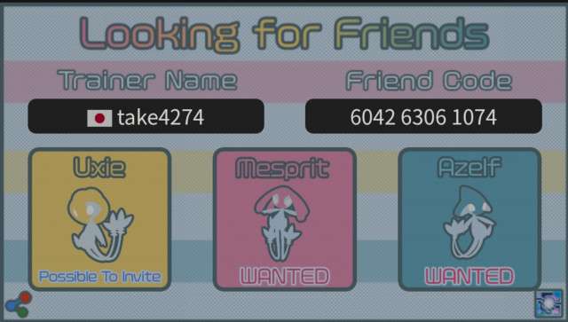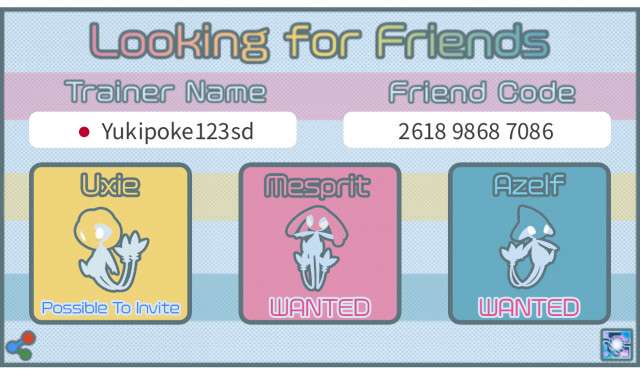 トレーナー名、トレーナーコード、国を入力した後、ユクシー、エムリット、アグノムをタップして「wanted(欲しい)」または「Possible to invite(招待できる)」を切り替え、「Save Picture」ボタンを押して画像を保存して下さい。Tweetボタンを押し保存した画像を添付することで簡単にフレンド募集できます。