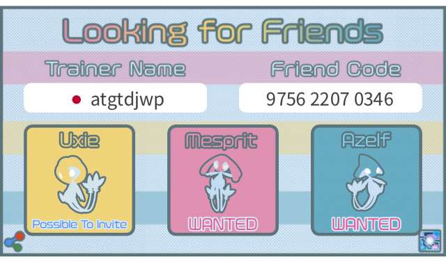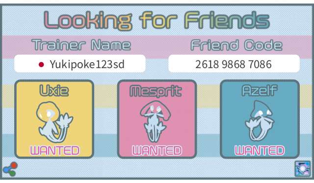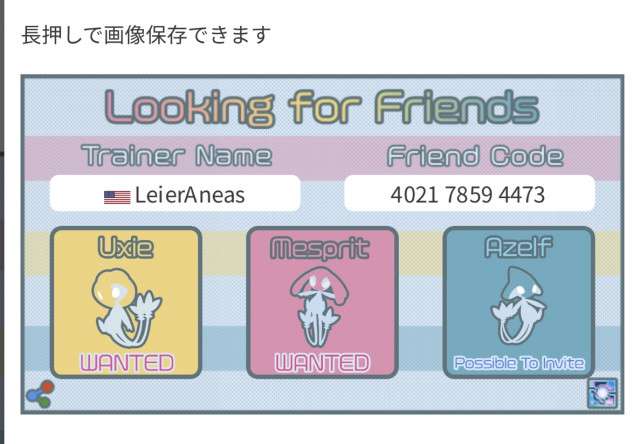 トレーナー名、トレーナーコード、国を入力した後、ユクシー、エムリット、アグノムをタップして「wanted(欲しい)」または「Possible to invite(招待できる)」を切り替え、「Save Picture」ボタンを押して画像を保存して下さい。Tweetボタンを押し保存した画像を添付することで簡単にフレンド募集できます。