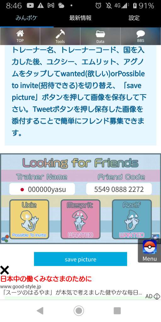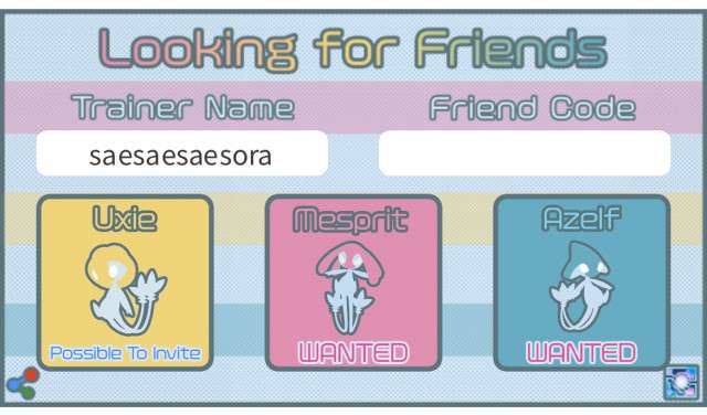 トレーナー名、トレーナーコード、国を入力した後、ユクシー、エムリット、アグノムをタップして「wanted(欲しい)」または「Possible to invite(招待できる)」を切り替え、「Save Picture」ボタンを押して画像を保存して下さい。Tweetボタンを押し保存した画像を添付することで簡単にフレンド募集できます。