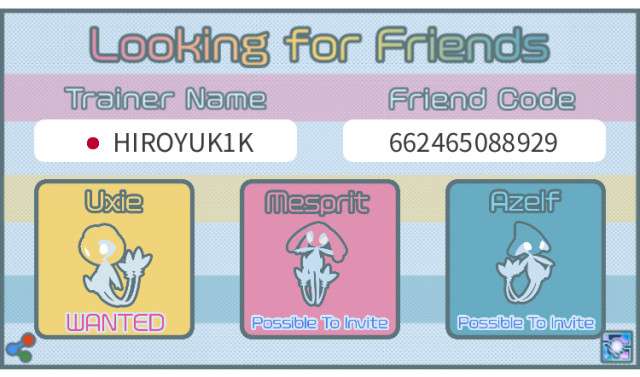 トレーナー名、トレーナーコード、国を入力した後、ユクシー、エムリット、アグノムをタップして「wanted(欲しい)」または「Possible to invite(招待できる)」を切り替え、「Save Picture」ボタンを押して画像を保存して下さい。Tweetボタンを押し保存した画像を添付することで簡単にフレンド募集できます。