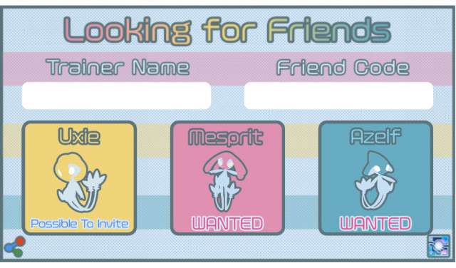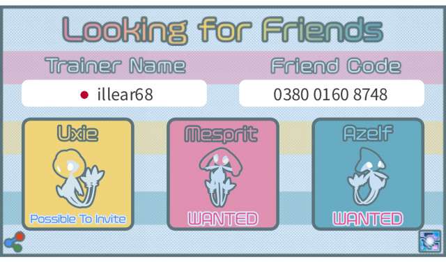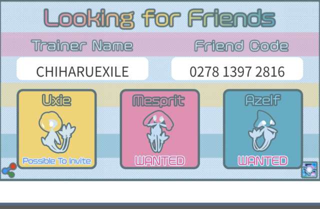 My trainer code : Looking for friends for Lake trio raids. I can invite Uxie raids. Please invite your Mesprit and Azelf raids. My trainer code : 0278 1397 2816