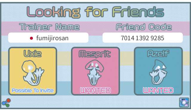 トレーナー名、トレーナーコード、国を入力した後、ユクシー、エムリット、アグノムをタップして「wanted(欲しい)」または「Possible to invite(招待できる)」を切り替え、「Save Picture」ボタンを押して画像を保存して下さい。Tweetボタンを押し保存した画像を添付することで簡単にフレンド募集できます。