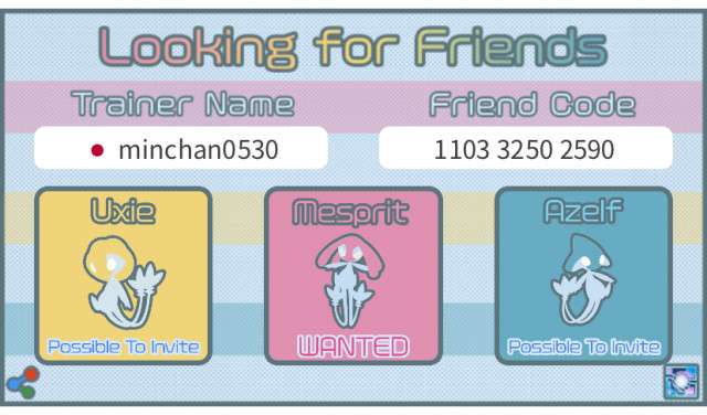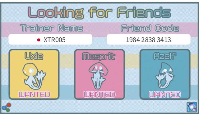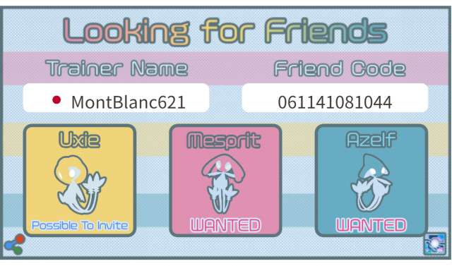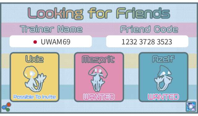 トレーナー名、トレーナーコード、国を入力した後、ユクシー、エムリット、アグノムをタップして「wanted(欲しい)」または「Possible to invite(招待できる)」を切り替え、「Save Picture」ボタンを押して画像を保存して下さい。Tweetボタンを押し保存した画像を添付することで簡単にフレンド募集できます。