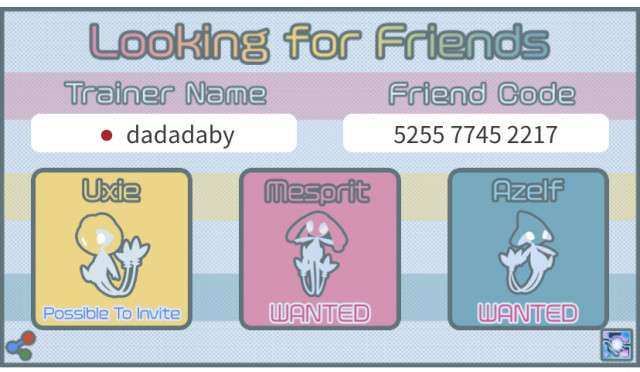 トレーナー名、トレーナーコード、国を入力した後、ユクシー、エムリット、アグノムをタップして「wanted(欲しい)」または「Possible to invite(招待できる)」を切り替え、「Save Picture」ボタンを押して画像を保存して下さい。Tweetボタンを押し保存した画像を添付することで簡単にフレンド募集できます。