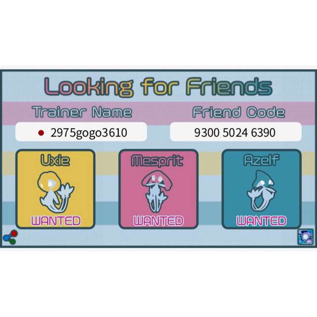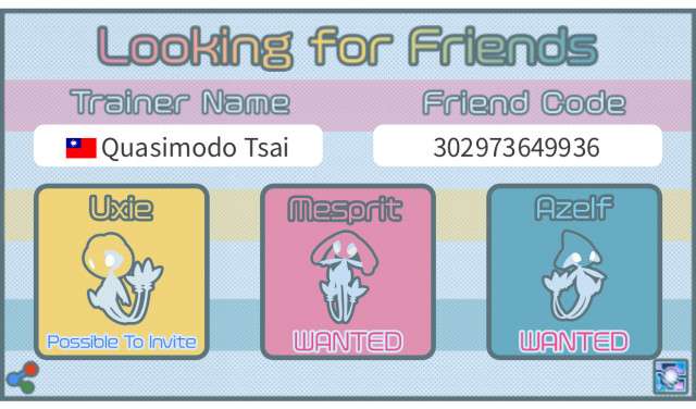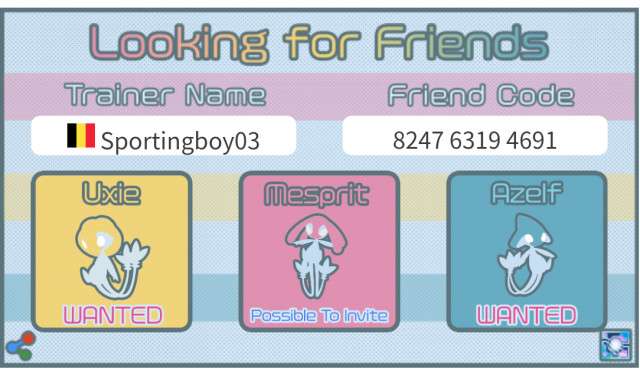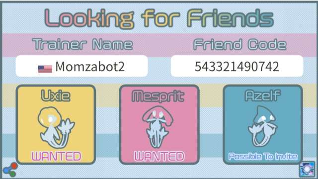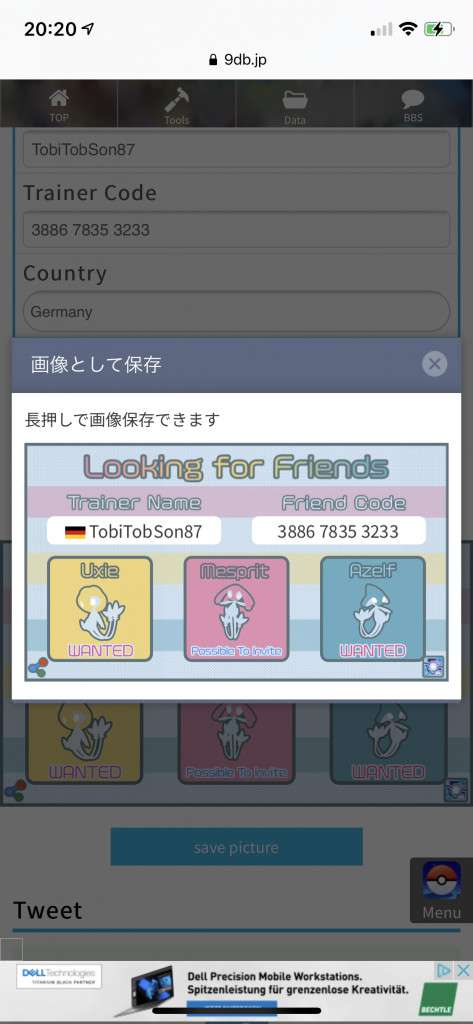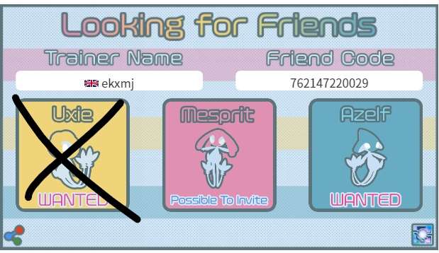トレーナー名、トレーナーコード、国を入力した後、ユクシー、エムリット、アグノムをタップして「wanted(欲しい)」または「Possible to invite(招待できる)」を切り替え、「Save Picture」ボタンを押して画像を保存して下さい。Tweetボタンを押し保存した画像を添付することで簡単にフレンド募集できます。