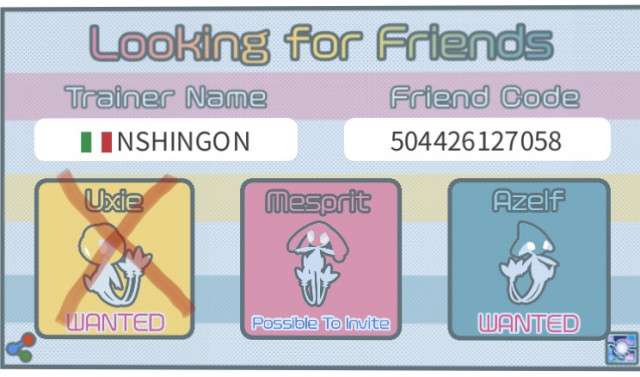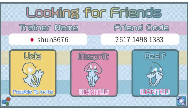 Please add me 2617 1498 1383. I need new friends for inviting me to mesprit raids. I invite you to the Uxie raid.🇯🇵