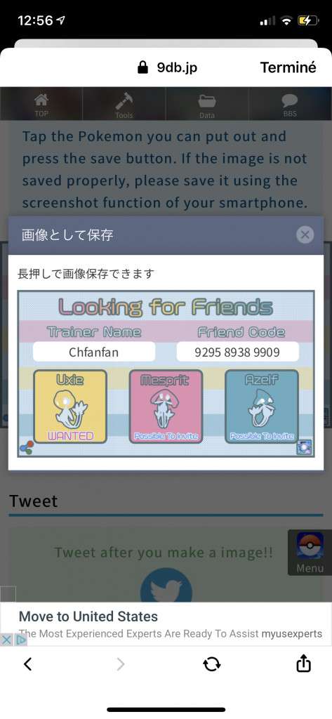 トレーナー名、トレーナーコード、国を入力した後、ユクシー、エムリット、アグノムをタップして「wanted(欲しい)」または「Possible to invite(招待できる)」を切り替え、「Save Picture」ボタンを押して画像を保存して下さい。Tweetボタンを押し保存した画像を添付することで簡単にフレンド募集できます。