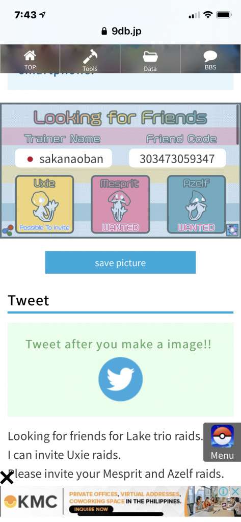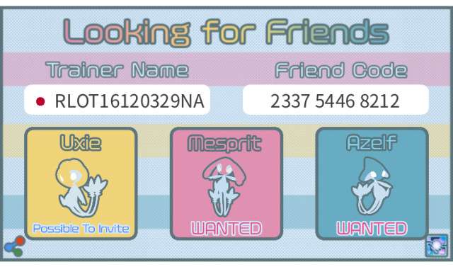 トレーナー名、トレーナーコード、国を入力した後、ユクシー、エムリット、アグノムをタップして「wanted(欲しい)」または「Possible to invite(招待できる)」を切り替え、「Save Picture」ボタンを押して画像を保存して下さい。Tweetボタンを押し保存した画像を添付することで簡単にフレンド募集できます。