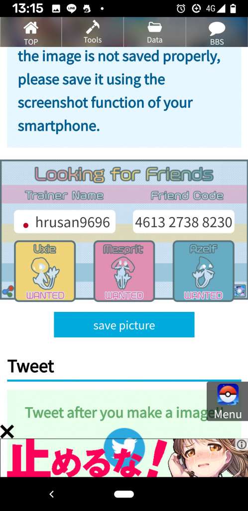 トレーナー名、トレーナーコード、国を入力した後、ユクシー、エムリット、アグノムをタップして「wanted(欲しい)」または「Possible to invite(招待できる)」を切り替え、「Save Picture」ボタンを押して画像を保存して下さい。Tweetボタンを押し保存した画像を添付することで簡単にフレンド募集できます。