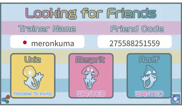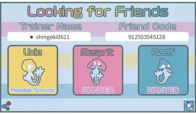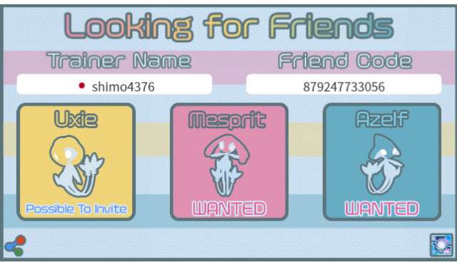 トレーナー名、トレーナーコード、国を入力した後、ユクシー、エムリット、アグノムをタップして「wanted(欲しい)」または「Possible to invite(招待できる)」を切り替え、「Save Picture」ボタンを押して画像を保存して下さい。Tweetボタンを押し保存した画像を添付することで簡単にフレンド募集できます。