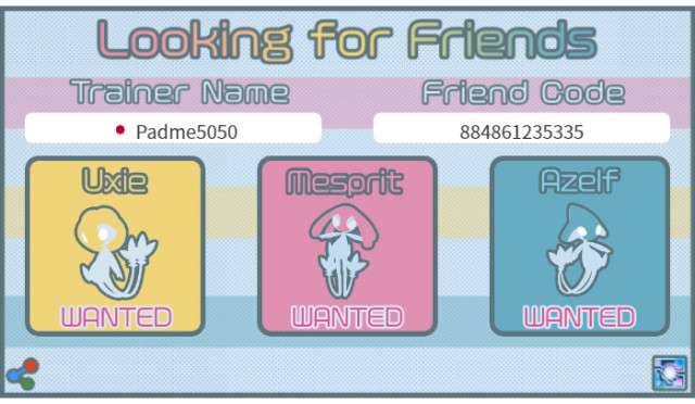トレーナー名、トレーナーコード、国を入力した後、ユクシー、エムリット、アグノムをタップして「wanted(欲しい)」または「Possible to invite(招待できる)」を切り替え、「Save Picture」ボタンを押して画像を保存して下さい。Tweetボタンを押し保存した画像を添付することで簡単にフレンド募集できます。