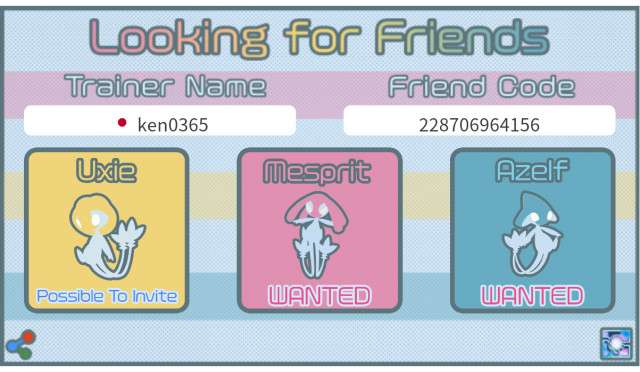 トレーナー名、トレーナーコード、国を入力した後、ユクシー、エムリット、アグノムをタップして「wanted(欲しい)」または「Possible to invite(招待できる)」を切り替え、「Save Picture」ボタンを押して画像を保存して下さい。Tweetボタンを押し保存した画像を添付することで簡単にフレンド募集できます。