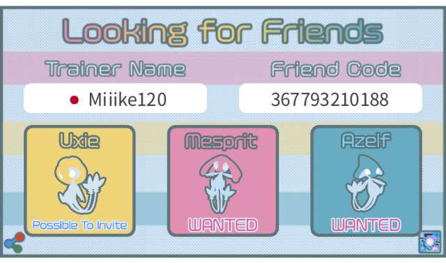 トレーナー名、トレーナーコード、国を入力した後、ユクシー、エムリット、アグノムをタップして「wanted(欲しい)」または「Possible to invite(招待できる)」を切り替え、「Save Picture」ボタンを押して画像を保存して下さい。Tweetボタンを押し保存した画像を添付することで簡単にフレンド募集できます。