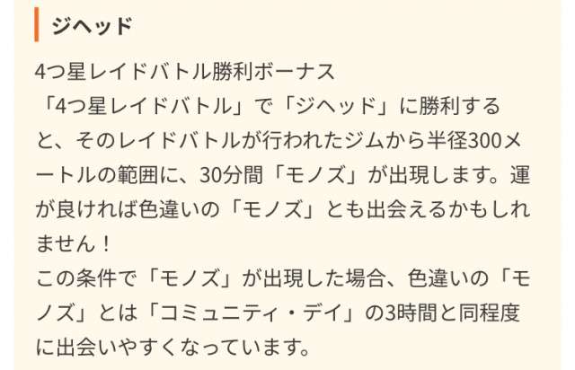 アディショナルレイド後にジム周辺に出るモノズの色違い率はコミュデイと同じみたいな情報も出てますね。これが本当なら時間内に参加できない人への救済ということになります。