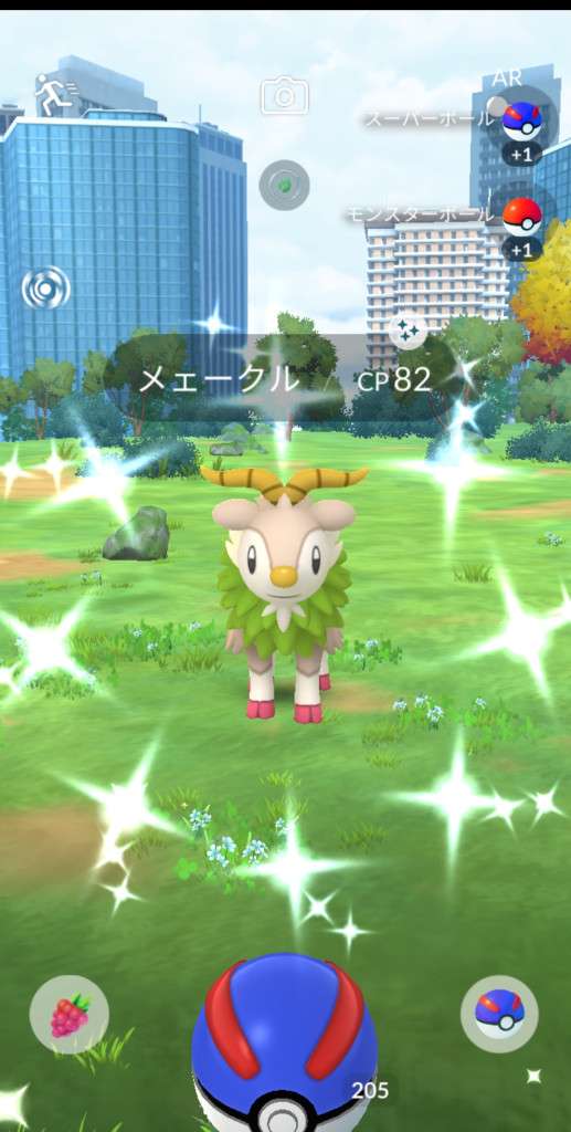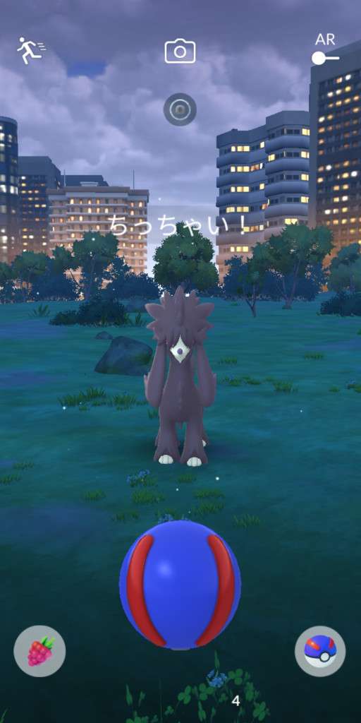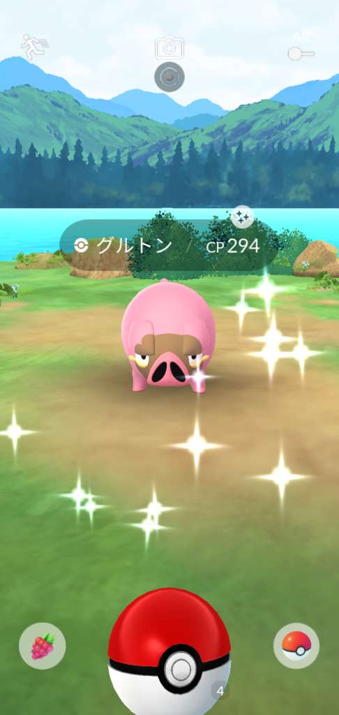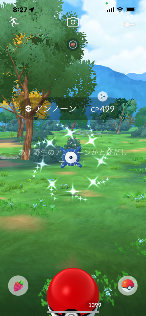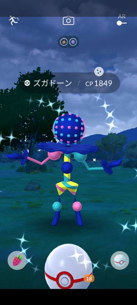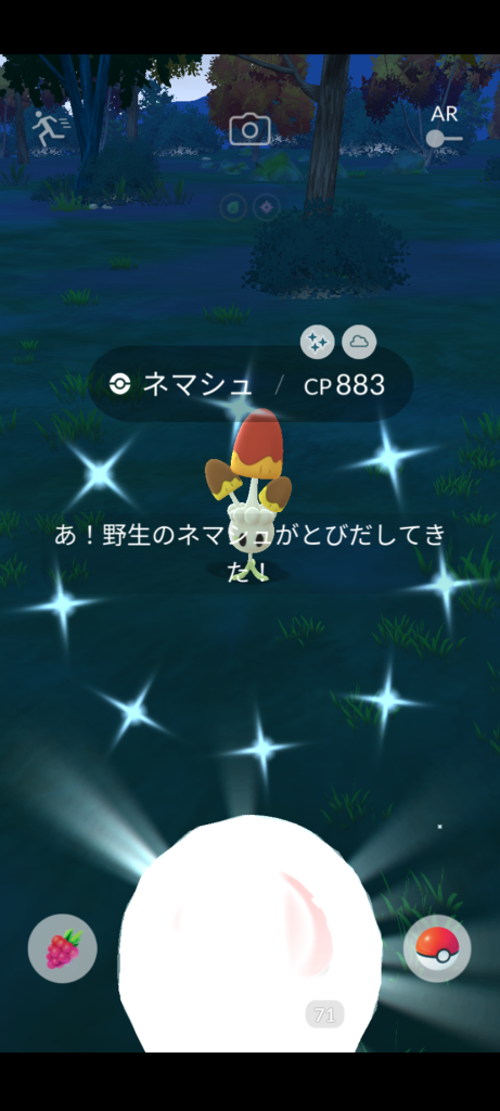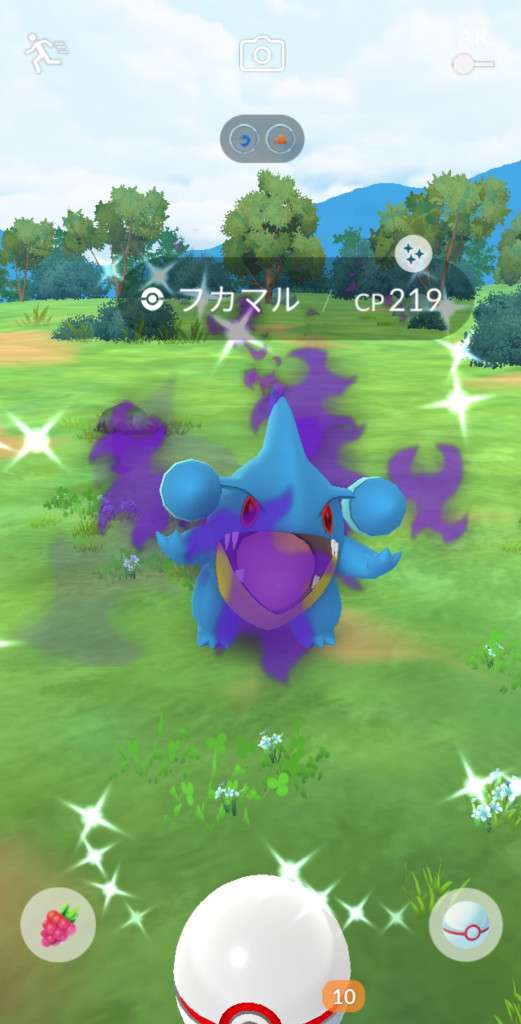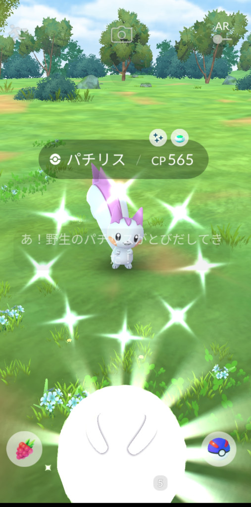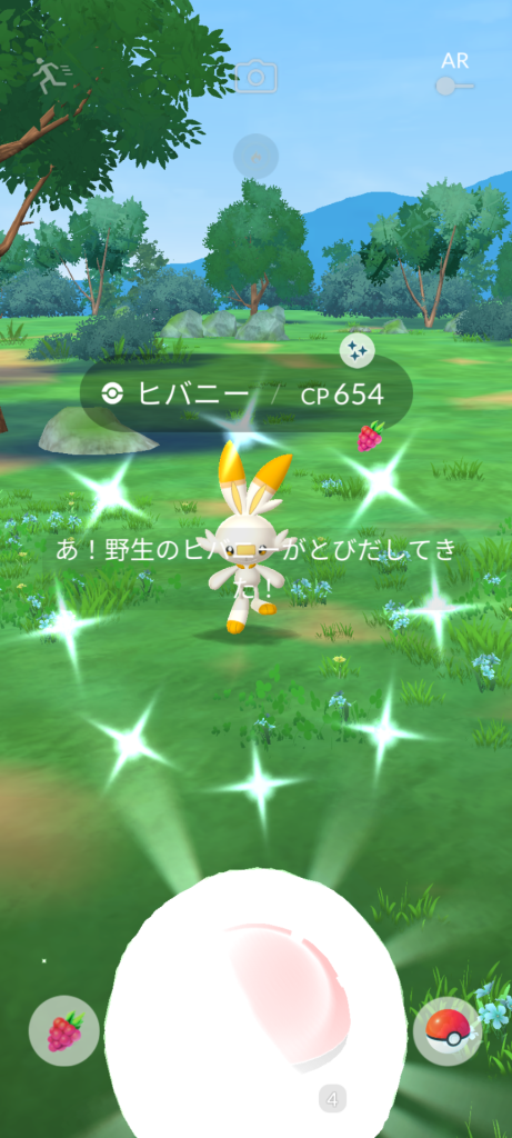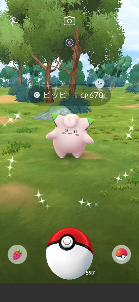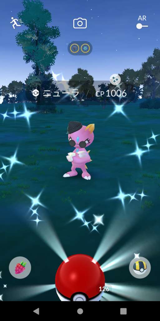 ・色違い出現したら、右上「AR+」のON・OFF切り替えで、タイミング良く写るまで何回も挑戦
