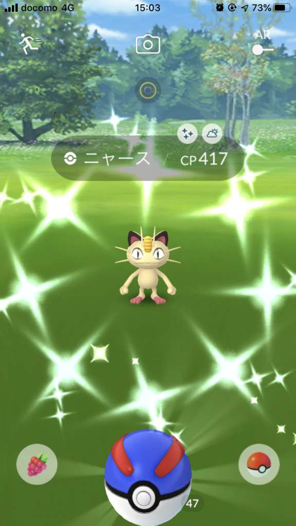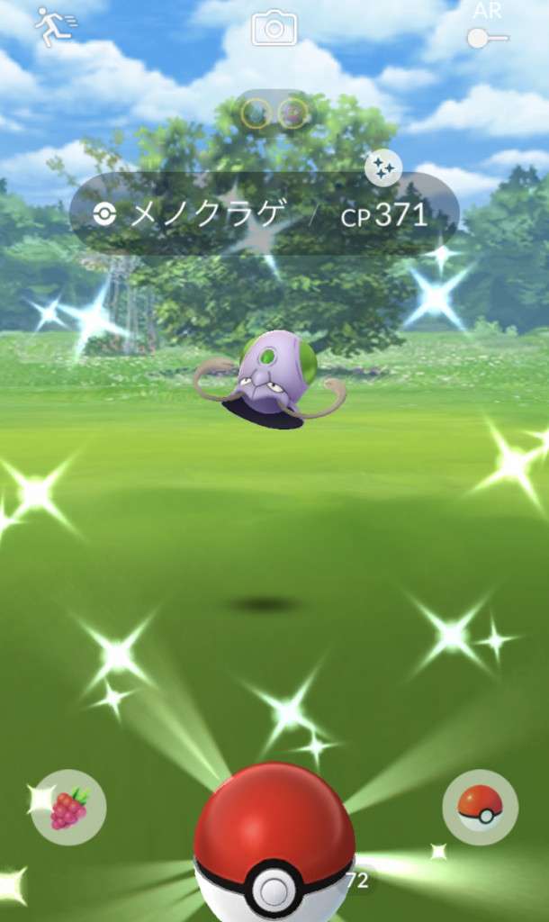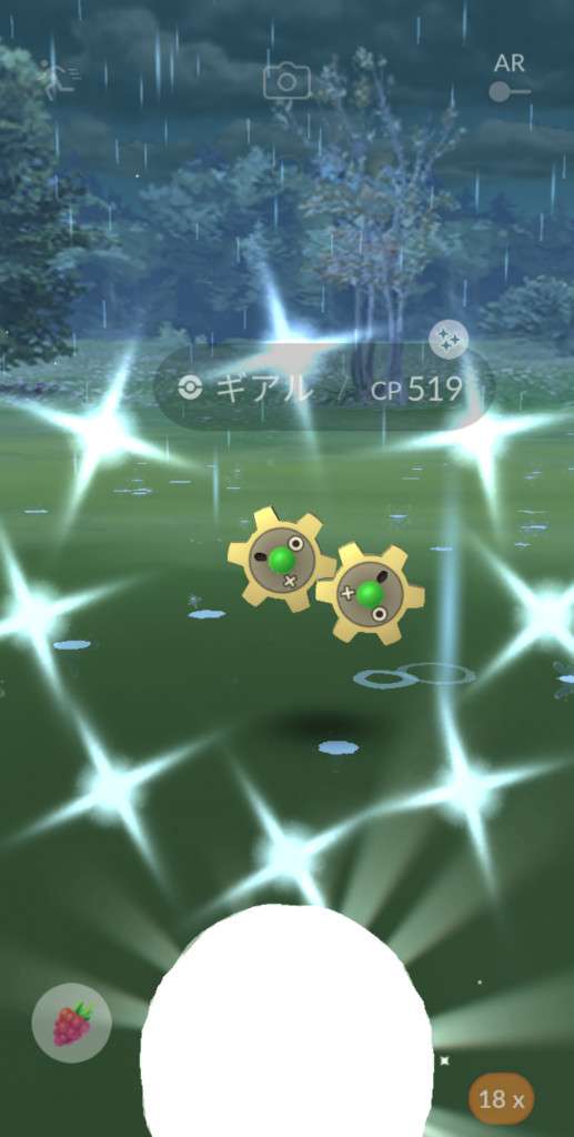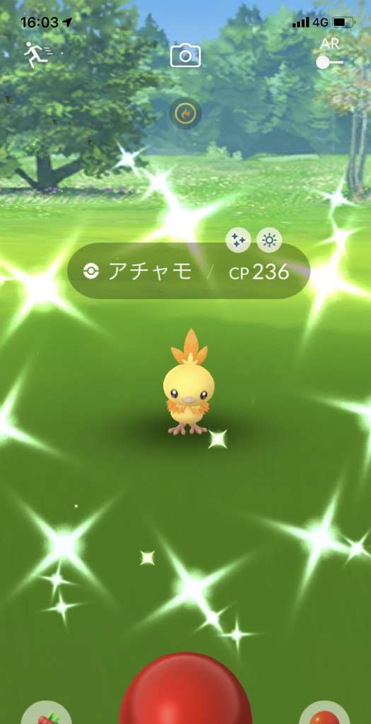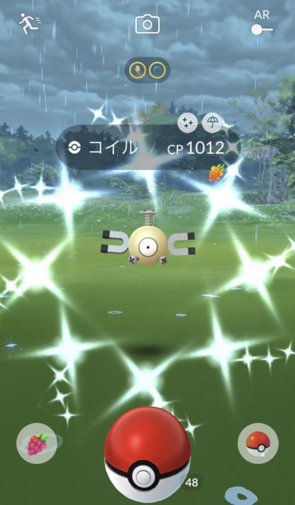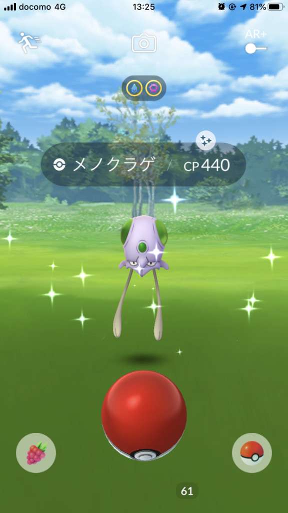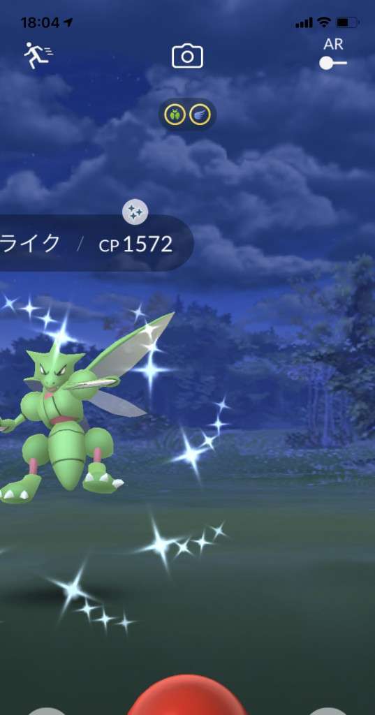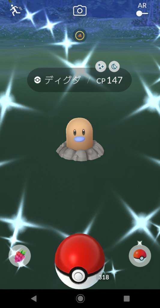 ・色違い出現したら、右上「AR+」のON・OFF切り替えで、タイミング良く写るまで何回も挑戦