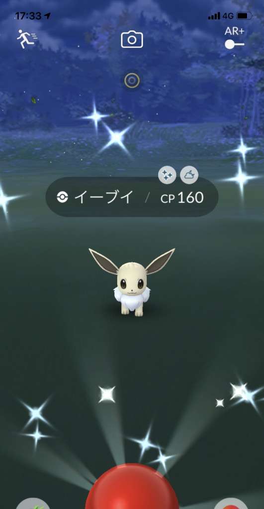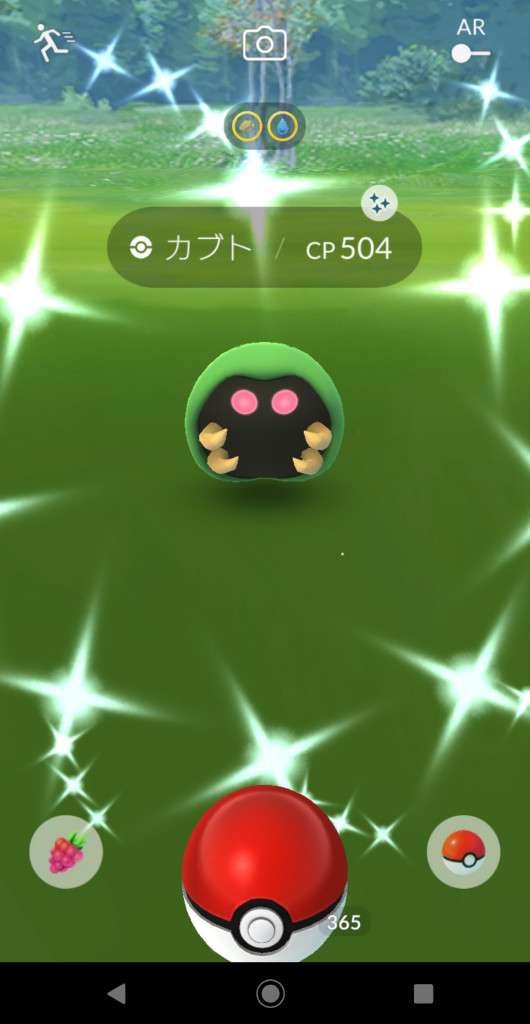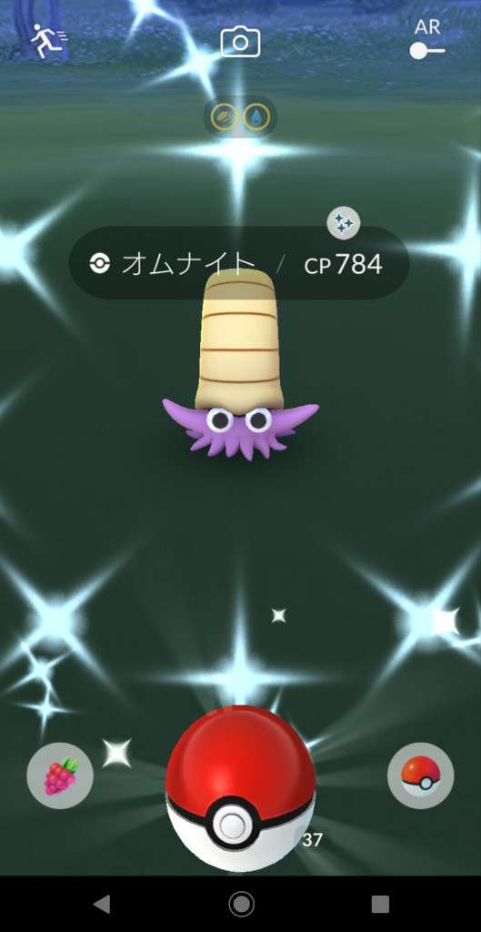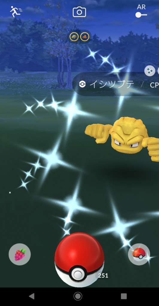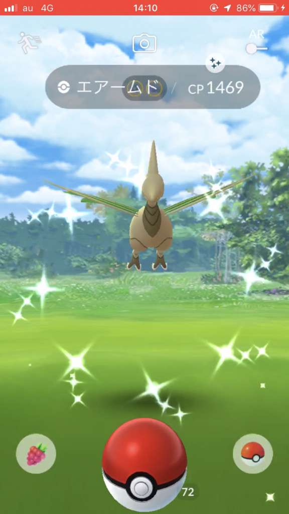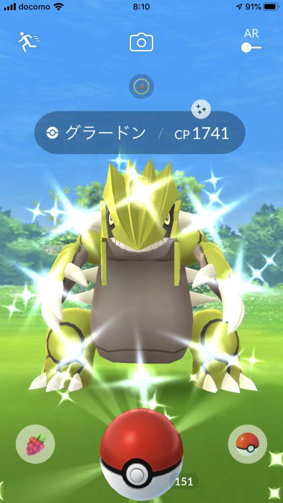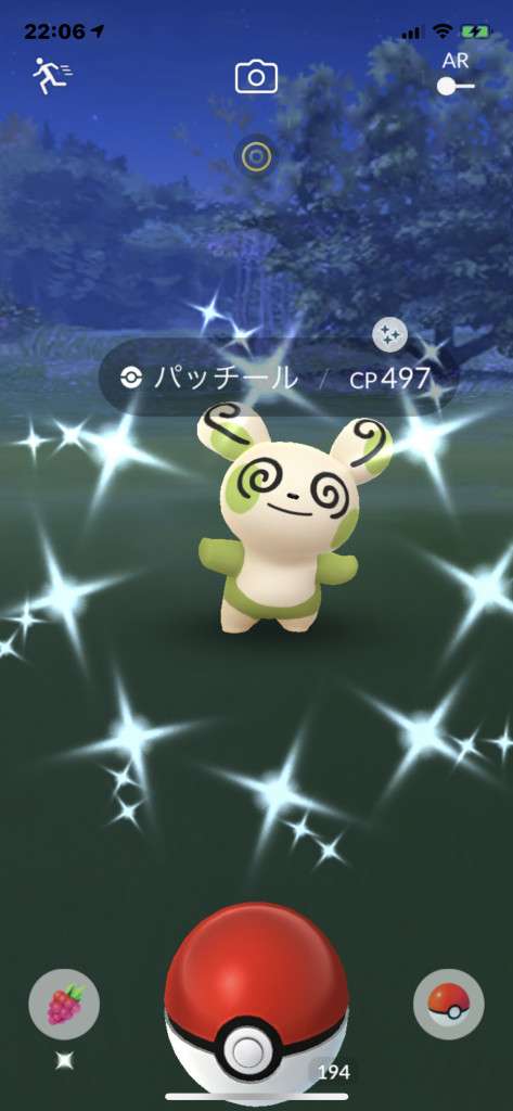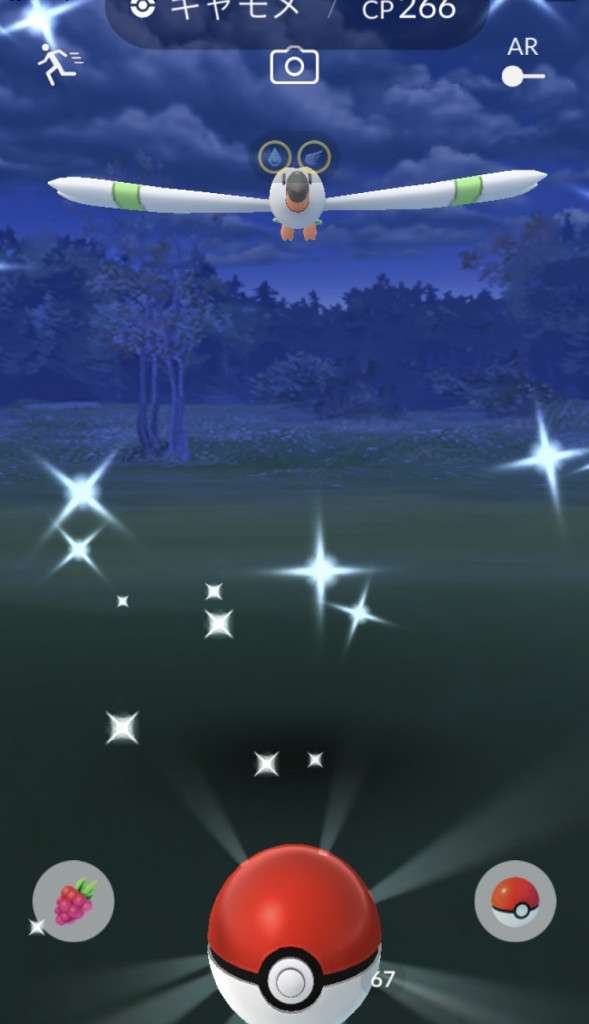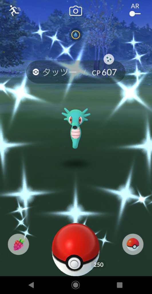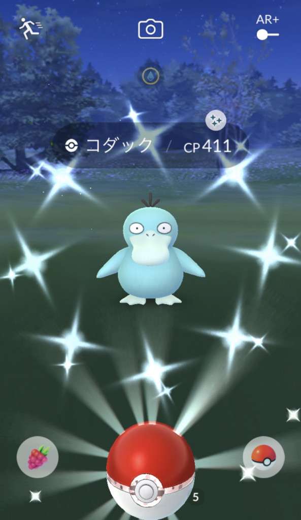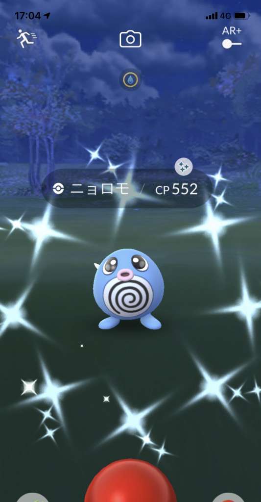 ・色違い出現したら、右上「AR+」のON・OFF切り替えで、タイミング良く写るまで何回も挑戦